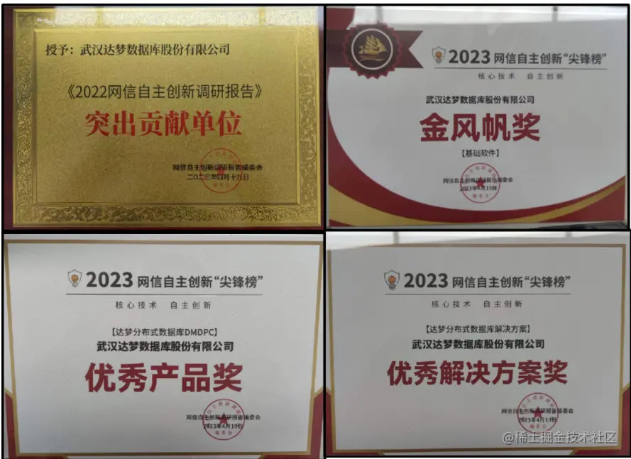 - 发布仪式上,达梦数据作为突出贡献单位获得表彰,并斩获“网信自主创新尖锋榜”金风帆、优秀产品、优秀解决方案多项大奖。