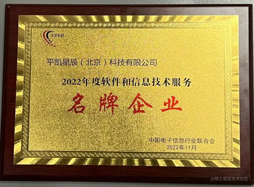 4月15日,在中国电子信息行业联合会主办的“2023 中国软件创新发展大会”上,平凯星辰荣获由中国电子信息行业联合会颁发的“2022年软件和信息技术名牌企业”奖牌。