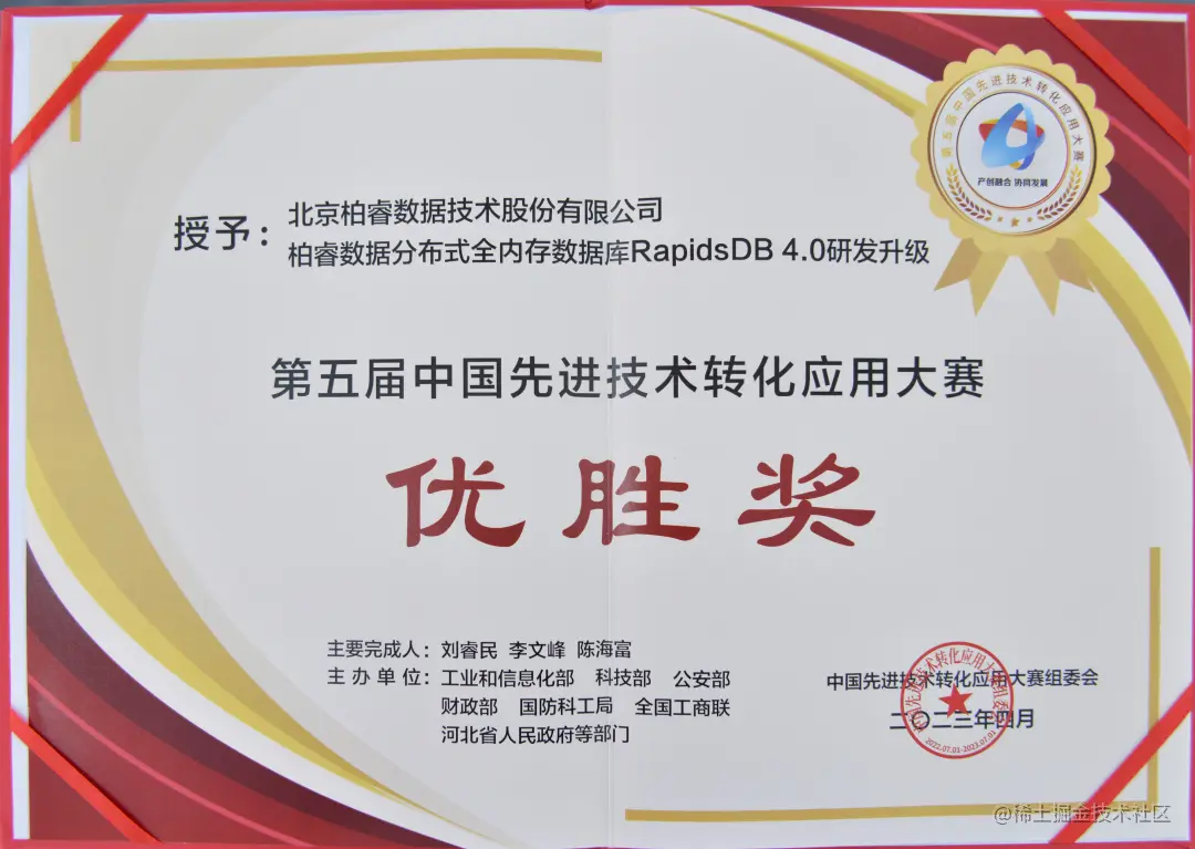 4月7日,由工业和信息化部、科技部、公安部、财政部、国防科工局、全国工商联、河北省人民政府等部门共同主办的第五届中国先进技术转化应用大赛圆满结束,柏睿数据分布式全内存数据库RapidsDB,从1000余个项目中脱颖而出,摘得本次大赛优胜奖,并进入《先进技术产品转化应用目录》。