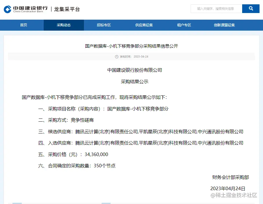 4月24日,中国建设银行股份有限公司发布《国产数据库-小机下移竞争部分》采购结果公示,腾讯云计算(北京)有限责任公司,平凯星辰(北京)科技有限公司,中兴通讯股份有限公司中标,中标金额合计3436万元。