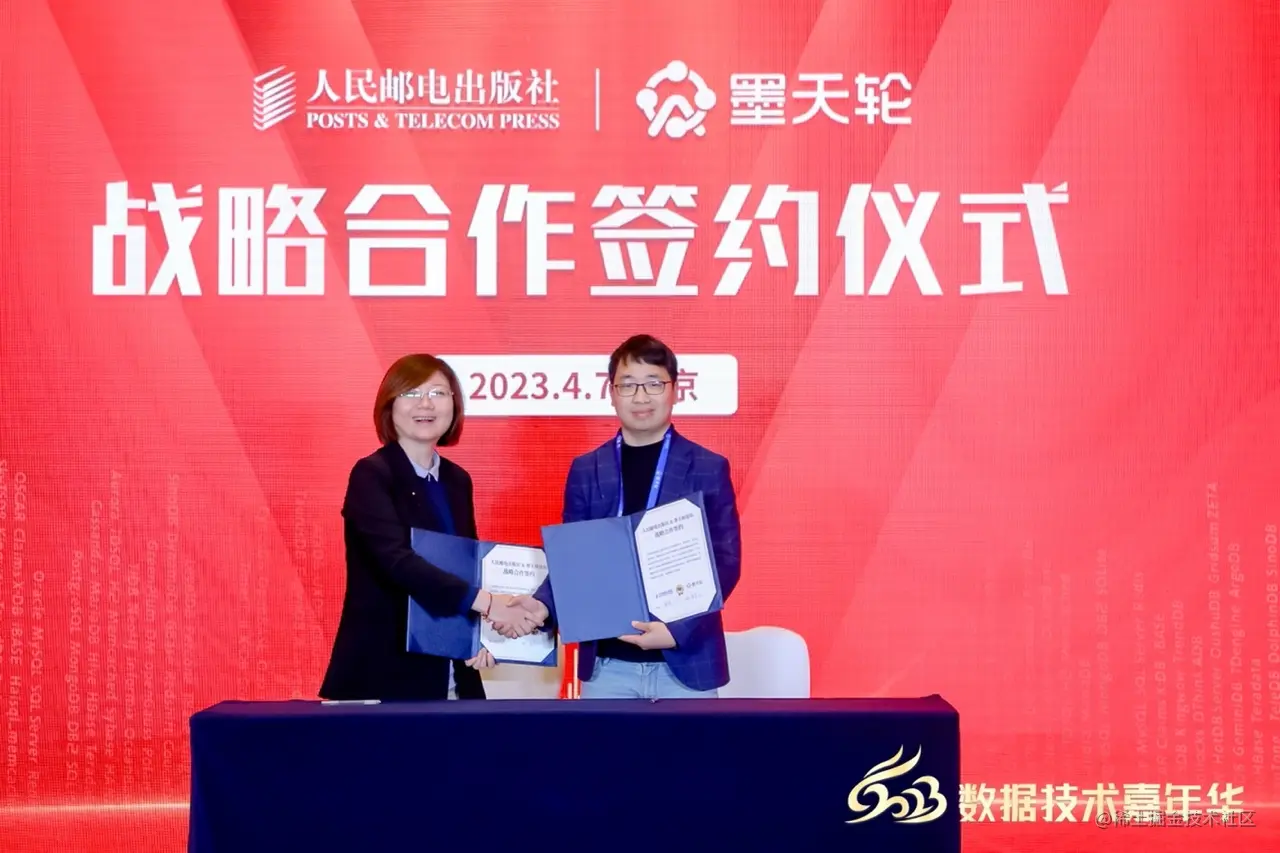- 在2023年数据技术嘉年华现场,云数互联信息技术有限公司(简称 “墨天轮”)与人民邮电出版社有限公司(简称 “人邮社”)举行合作签约仪式。双方就墨天轮论坛相关资源转化为数据领域相关图书的出版及项目达成合作共识。