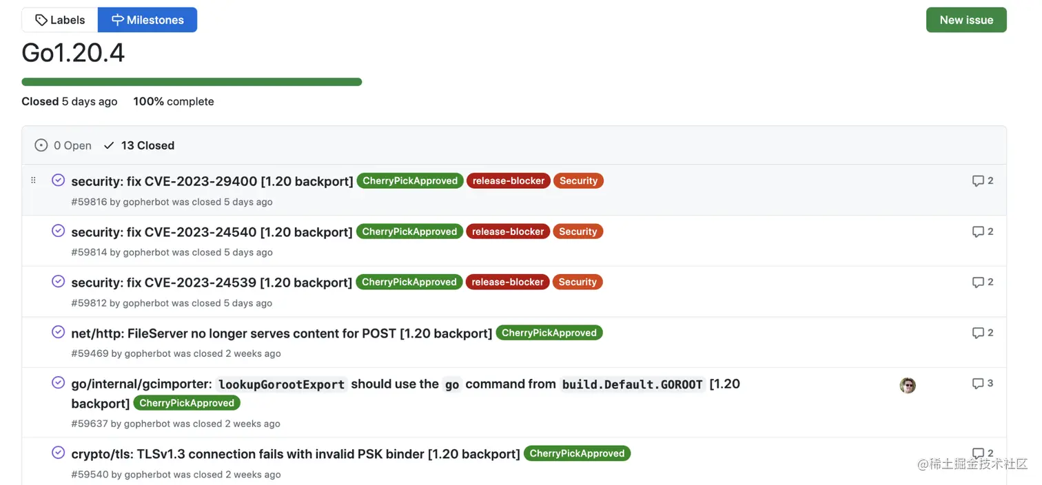 有兴趣的同学可以及时查看 Go1.20.4 Milestone 和更新 Go 版本进行处理。