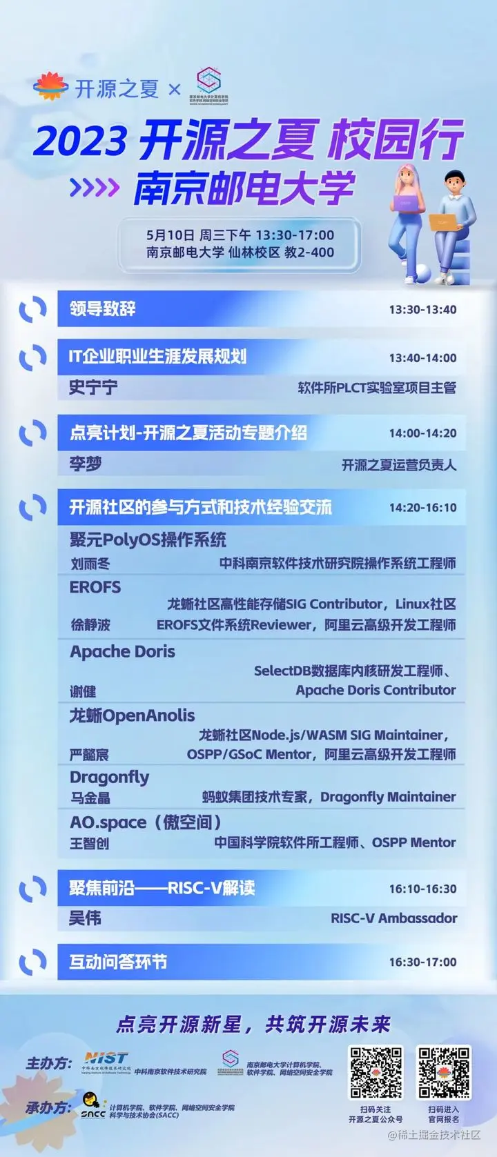 夏日将至,开源之夏 2023 活动学生报名正在如火如荼进行中。为了让更多学生深入了解开源参与开源,开源之夏活动携手龙蜥开源社区,于 2023 年 5 月 10 日(本周三)下午 13:30-17:00,在南京邮电大学开启“开源之夏校园行”之旅。