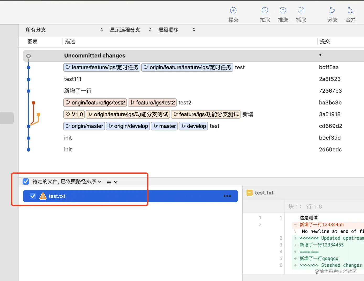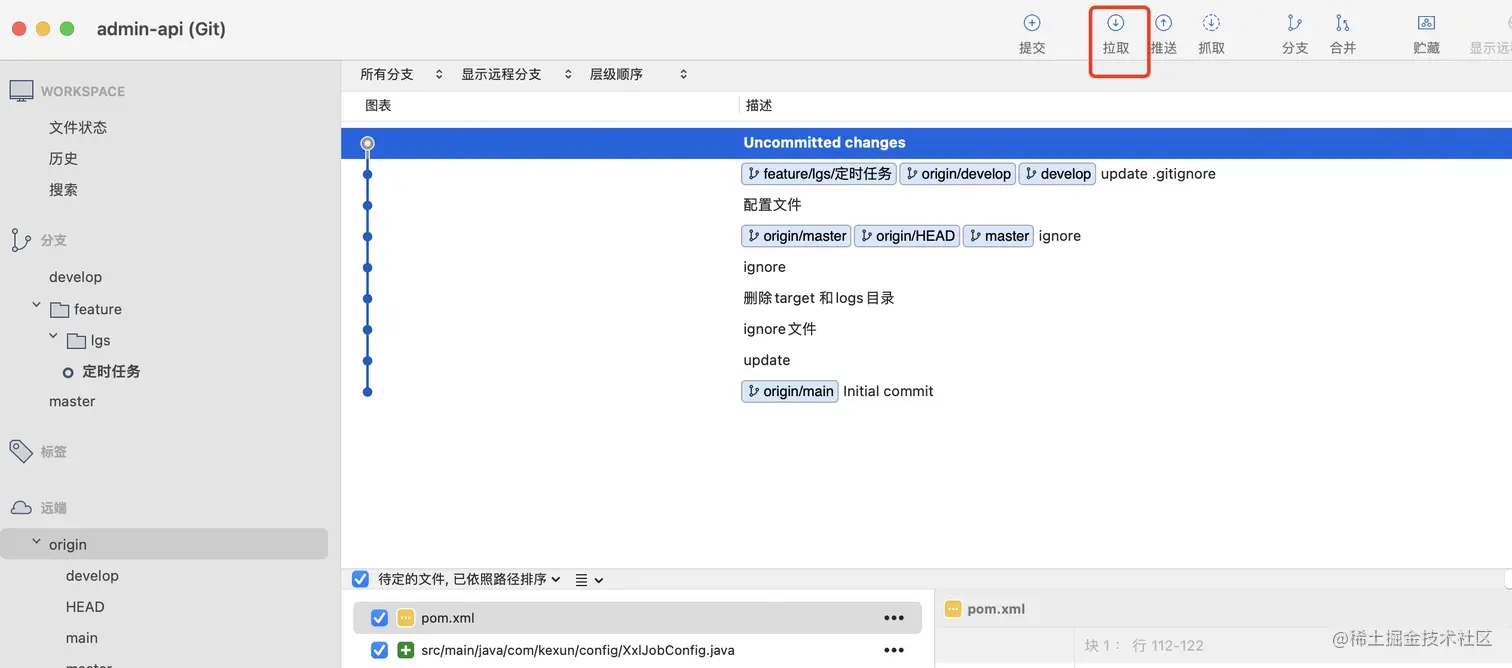 拉取代码是把远程分支的代码拉取到本地,会和本地代码进行合并,如果有冲突,则会提示冲突