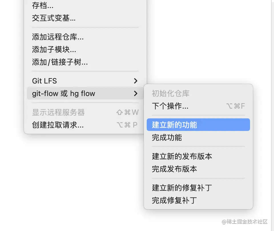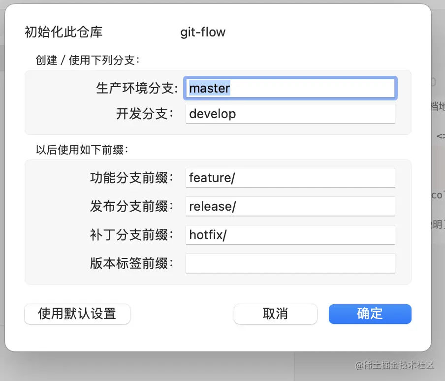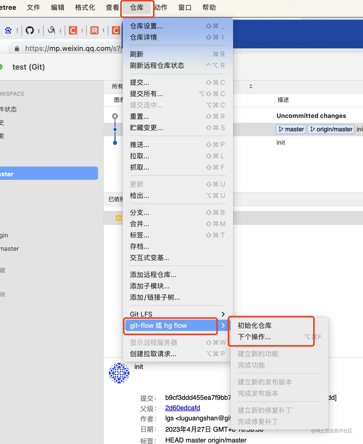 每个客户端都需要进行初始化仓库,本地按照git-flow进行。进行初始化的作用就是按照上文提到的既定的标准流程初始化库。