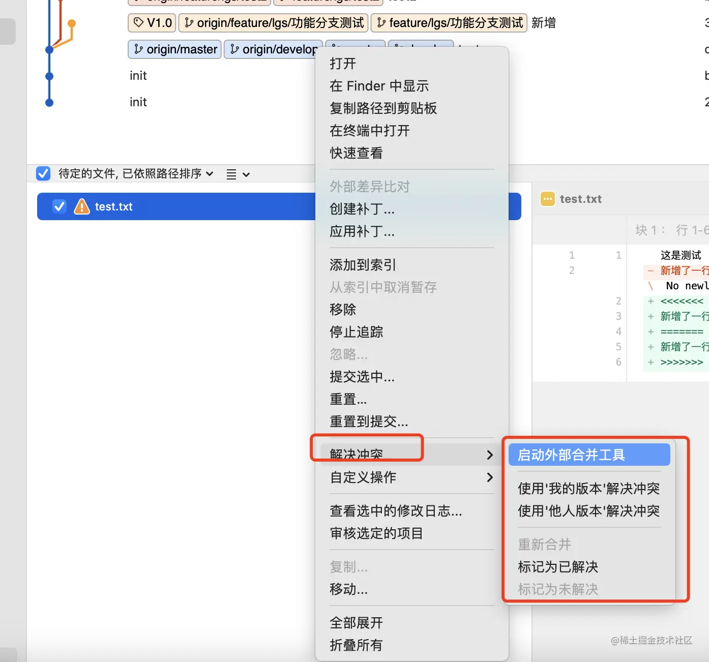 此时可能会有冲突出现,需要解决冲突。解决冲突的步骤详细参考上面解决冲突步骤。