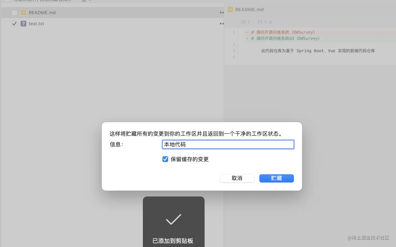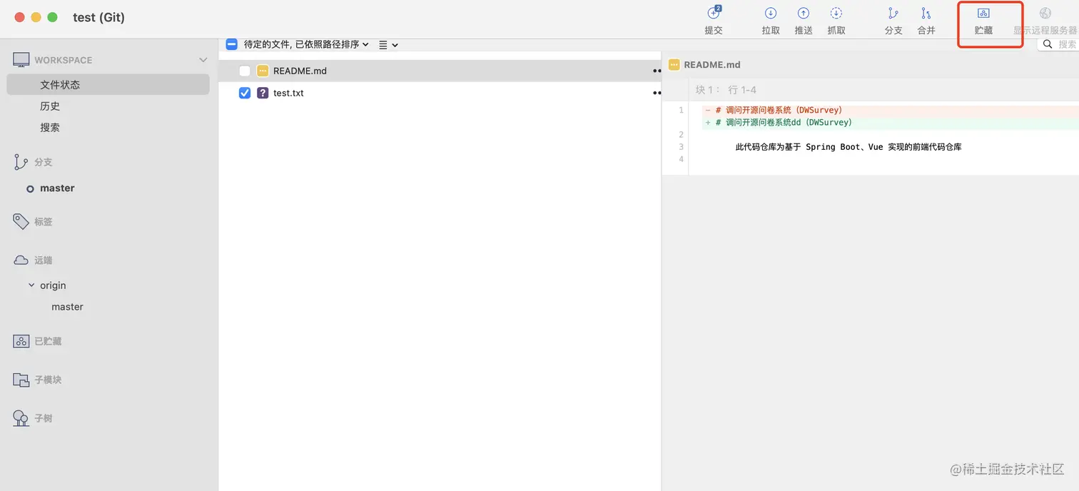 可以将本地修改的代码,先进行缓存。这种一般情况下是拉取远程代码有问题的时候,为了防止冲突,先把本地代码进行储存,然后拉取远程代码,在应用储藏区即可。