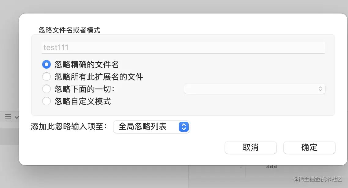 这里支持忽略精确的单个文件、忽略所有扩展名、忽略文件夹下的一切等。忽略以后,我们不会看到这些文件的变动