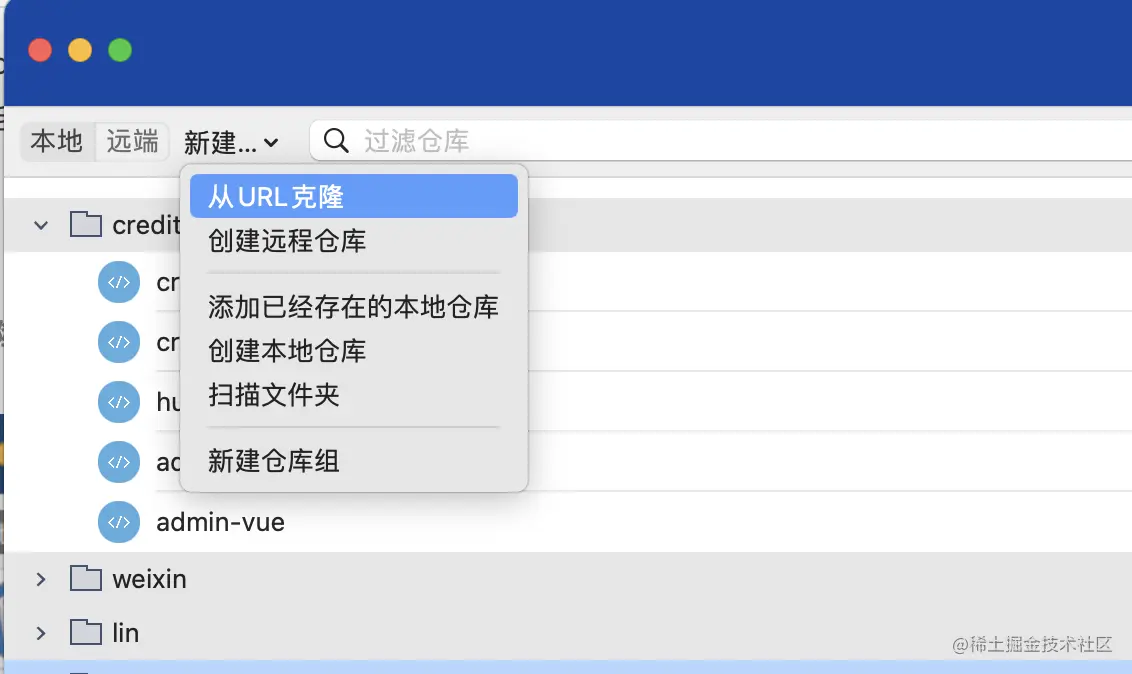- 克隆(clone):从远程仓库URL加载创建一个与远程仓库一样的本地仓库