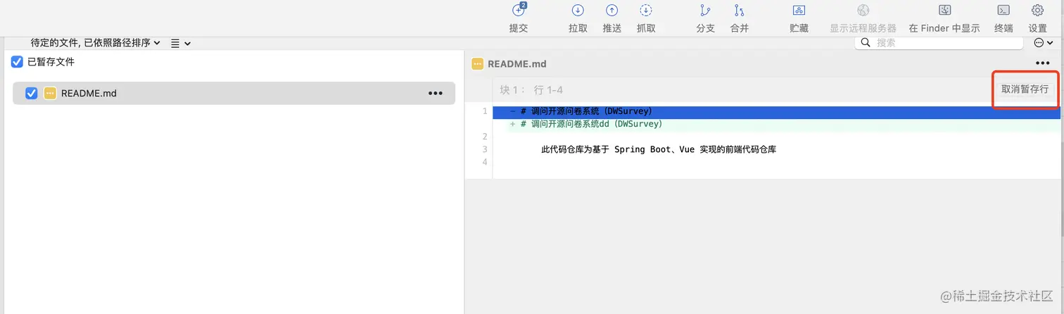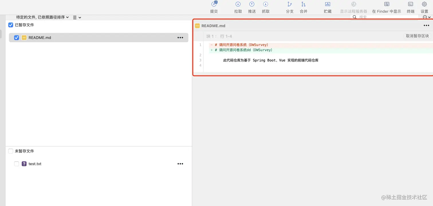 可以取消暂存区块。sourcetree 会把所有的变更以区块来分组,所以如果是整个区块的变更都没有意义,可直接丢弃整个块