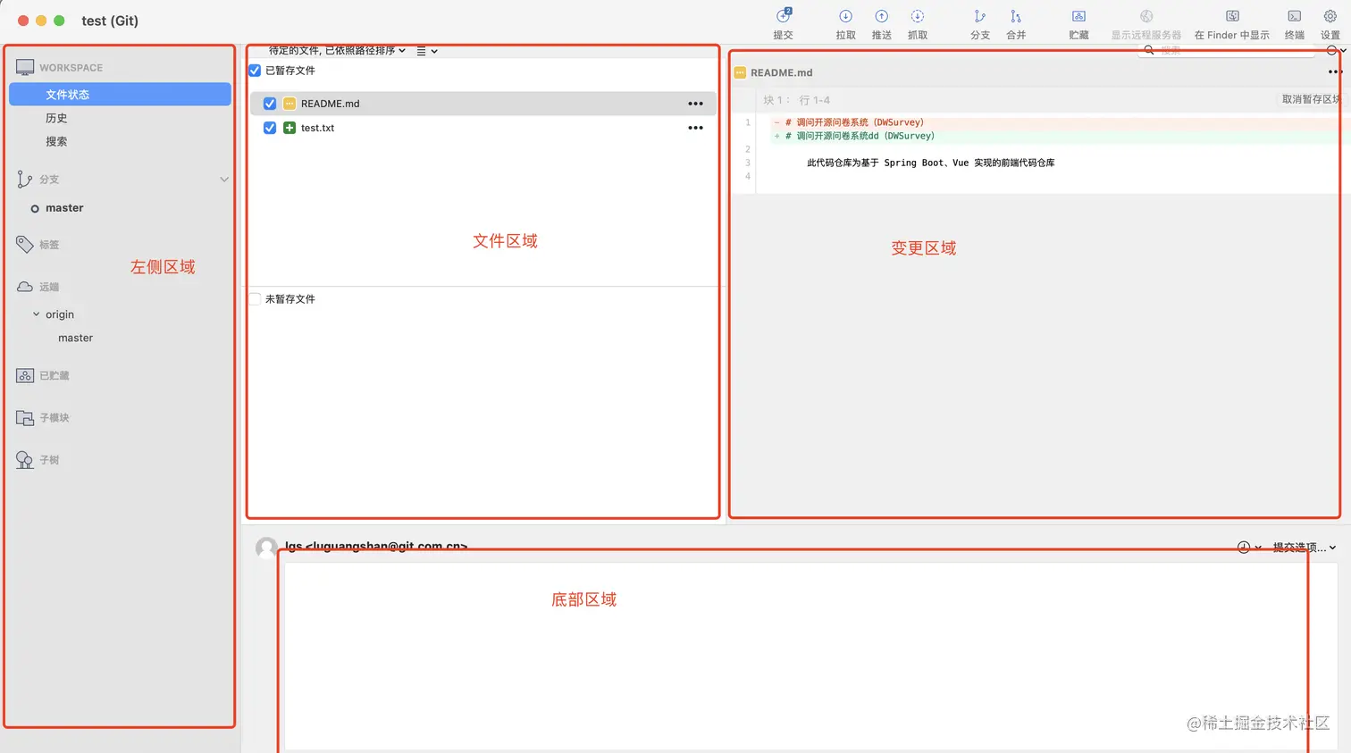 左侧区域,文件区域,变更区域,底部区域。其中文件区域的展示根据设置不同可以有不同展示。