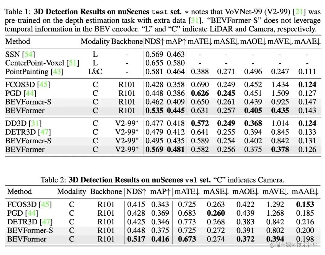 BEVFormer模型在nuScenes数据集上的实验结果表明其有效性。当其他条件相同的情况下,使用时序特征的BEVFormer比不使用时序特征的BEVFormer-S在NDS指标上提高了7个以上的点数。