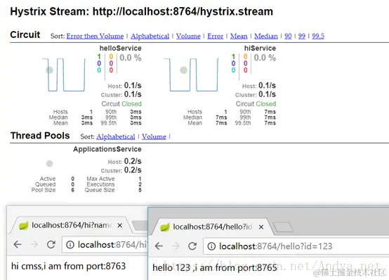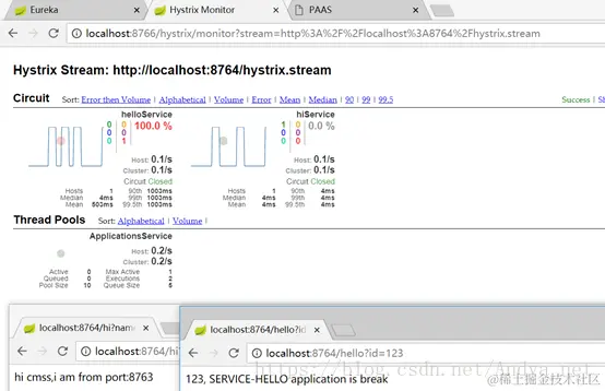(2)通过SERVICE-RIBBON分别触发SERVICE-HI和SERVICE-HELLO应用,发现SERVICE-HELLO已熔断;