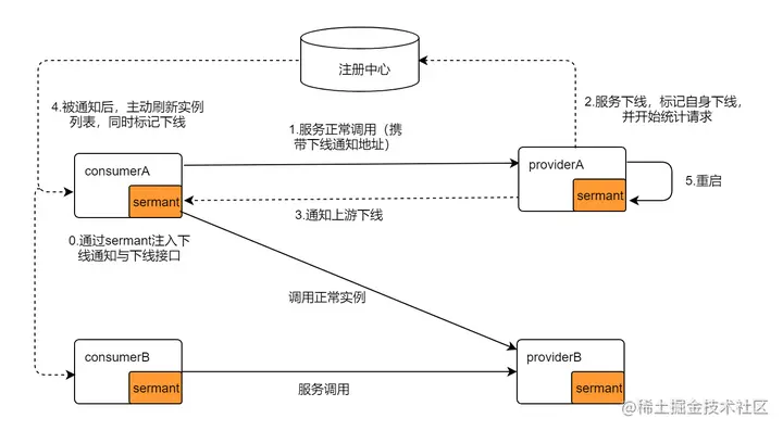 上图描述了Sermant是如何解决服务下线问题的: 0. 微服务应用consumerA、providerA、consumerB、providerB携带Sermant启动,并将相关ip:port等信息注册到注册中心;