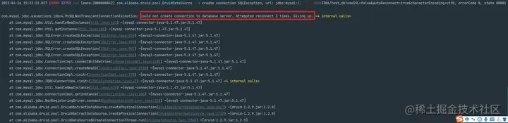 在应用上线发布过程中,由于过早暴露服务,实例可能仍处在JVM JIT编译或者使用的中间件还在加载,若此时大量流量进入,可能会瞬间压垮新起的服务实例。我们在实际场景中,曾经遇到provider服务启动后,但是数据库连接出现异常,未做好启动前的资源准备,导致该provider服务在注册中心暴露后DB异常还未修复,无法正常提供被consumer调用的能力,导致大量请求异常返回。如下图日志所示,应用初始化时,DB连接失败(该服务对DB是弱依赖)。