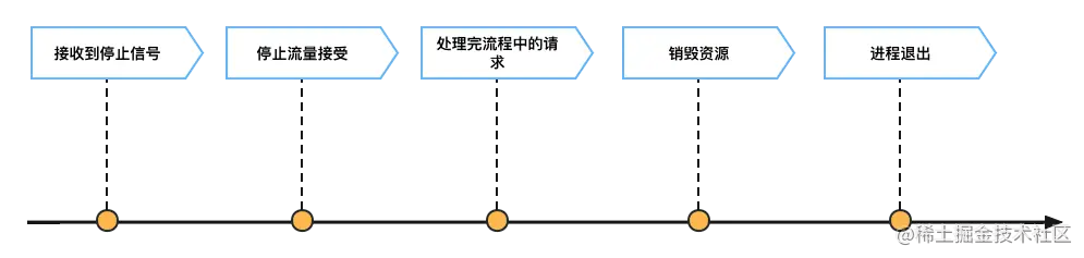 合理的应用下线大致分为这样一个过程:当应用接受到外部的关闭(停止服务)请求后,不能在接收新的业务请求,但是会存在一些正在处理的业务请求,需等这些请求处理完后再销毁应用使用的资源,最后就可以通知主进程退出。