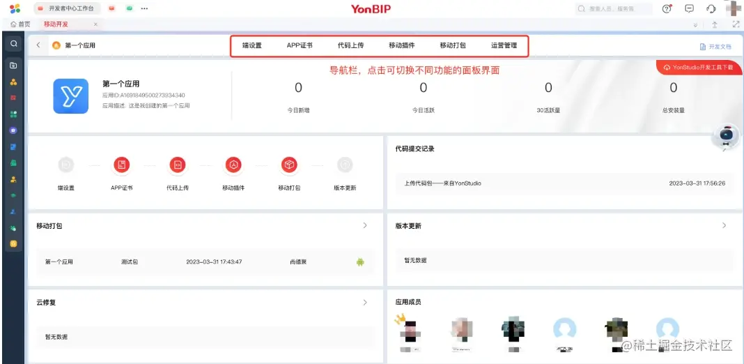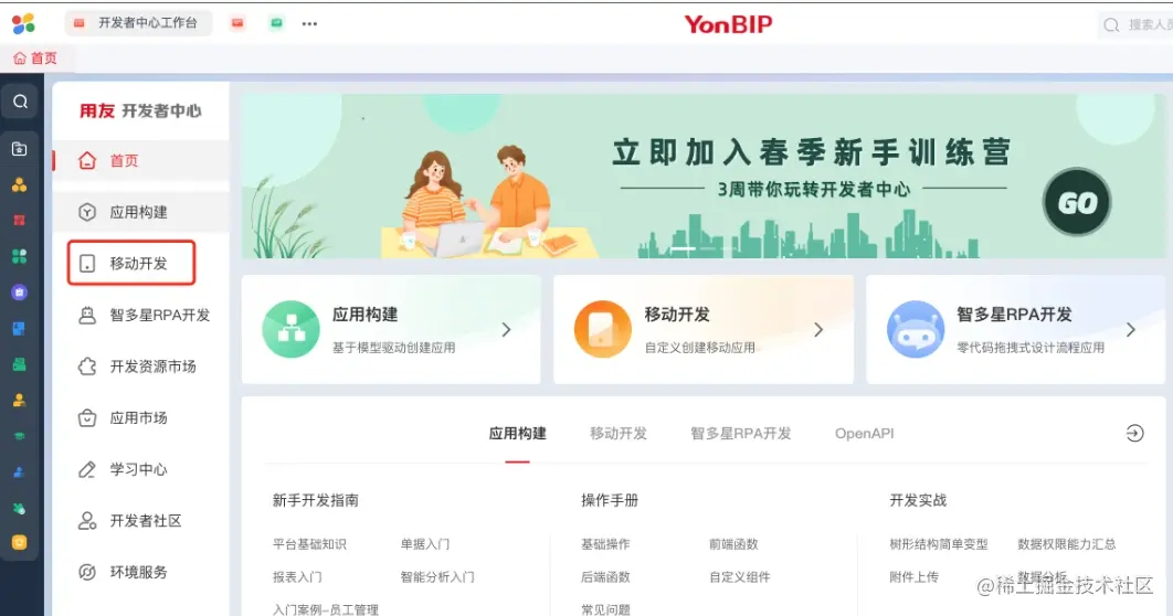 - 登录用友开发者中心网站:developer.yonyou.com - 点击左侧菜单栏中的「移动开发」(或 点击左上角「大风车」图标,选择 云平台-低代码开发平台-移动APP开发)