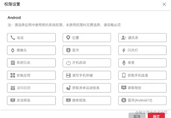 本次应用没有用到任何隐私权限,所以无需勾选权限。如果应用用到了二维码扫描功能,就需要勾选相机权限,如果用到了地图定位功能,就需要勾选位置权限,不同的权限对应不同的具体功能。