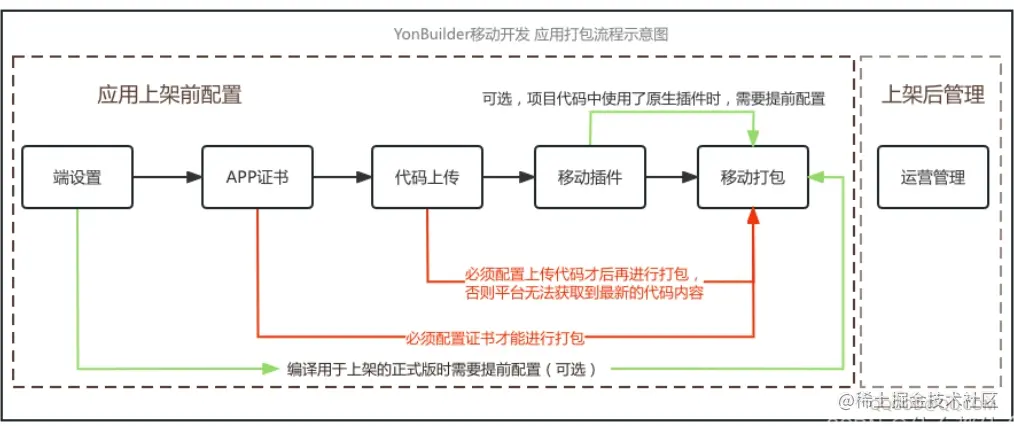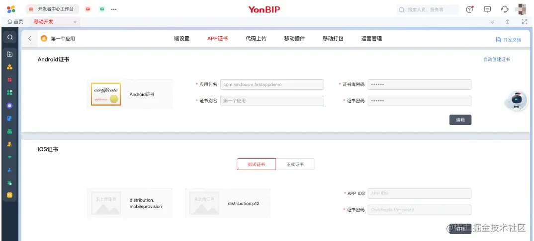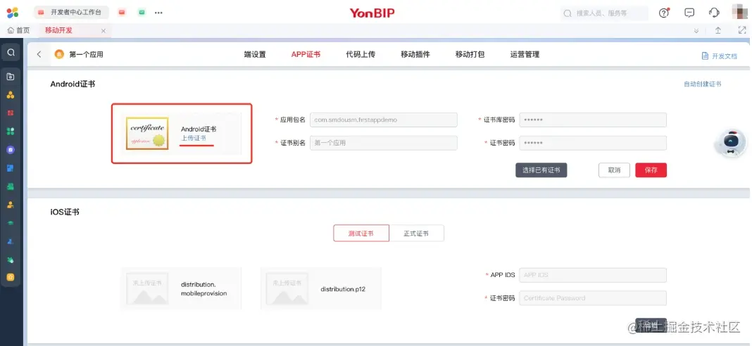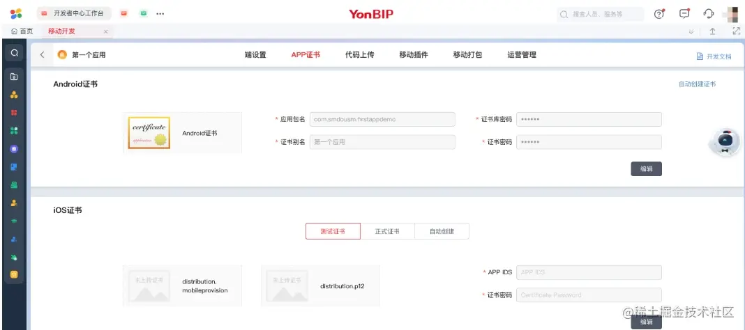 配置应用的Android或iOS证书,在进行「移动打包」前,需要提前配置证书才可以进行应用的安装包编译打包。 (本文稍后 6.2 章节会有详细的操作说明)