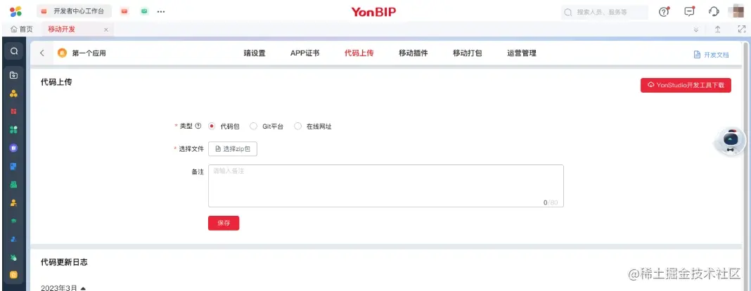 应用的项目代码上传和管理入口,在进行「移动打包」前,需要提前将最新的应用代码上传到云开控制台。(「代码上传」功能在前一章节 (2) 中已进行过使用介绍)