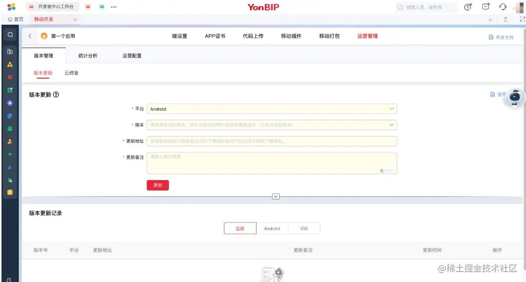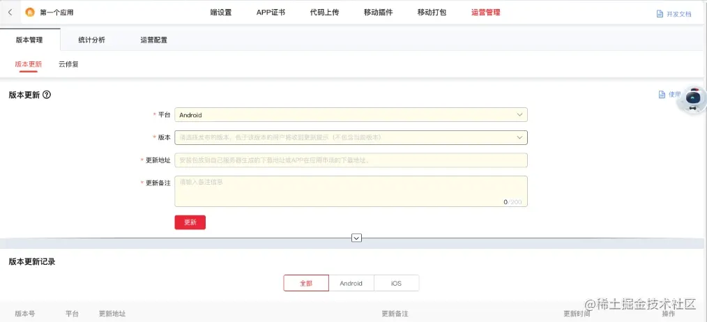 版本管理: 包含「版本更新」和「热修复」两个功能,该功能的使用需要在应用移动打包生成安装包前,在「端设置」里开启相关功能才会生效