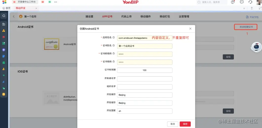 选择「自动创建证书」-> 在弹出的界面内填写内容后,点击「创建并保存」,完成证书的创建。