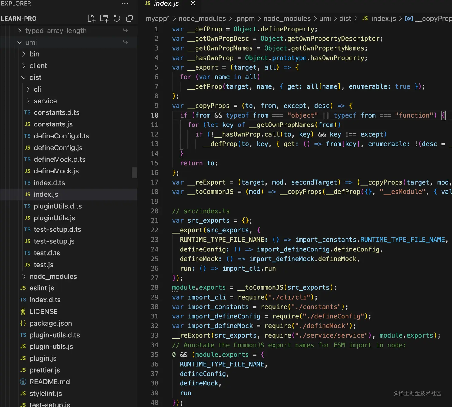 @umijs/max 导出的其实是 umi 包的全部方法,那么继续在 node_modules 中看下 umi 的代码,其入口在 /examples/with-use-model/node_modules/.pnpm/node_modules/dist/index.js 中: