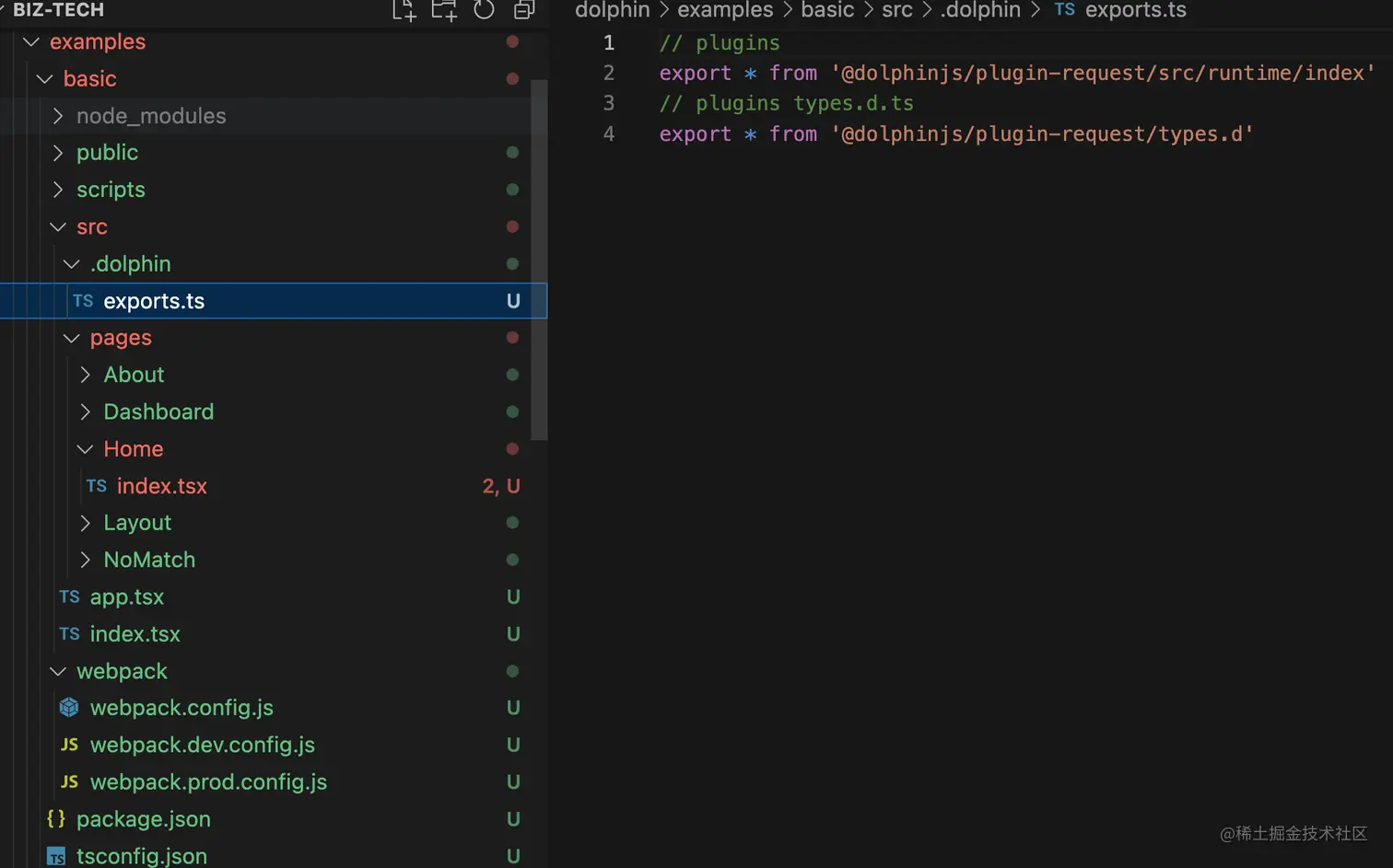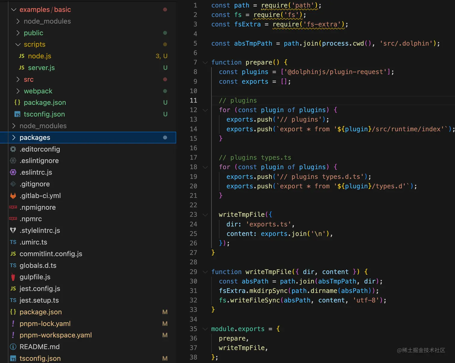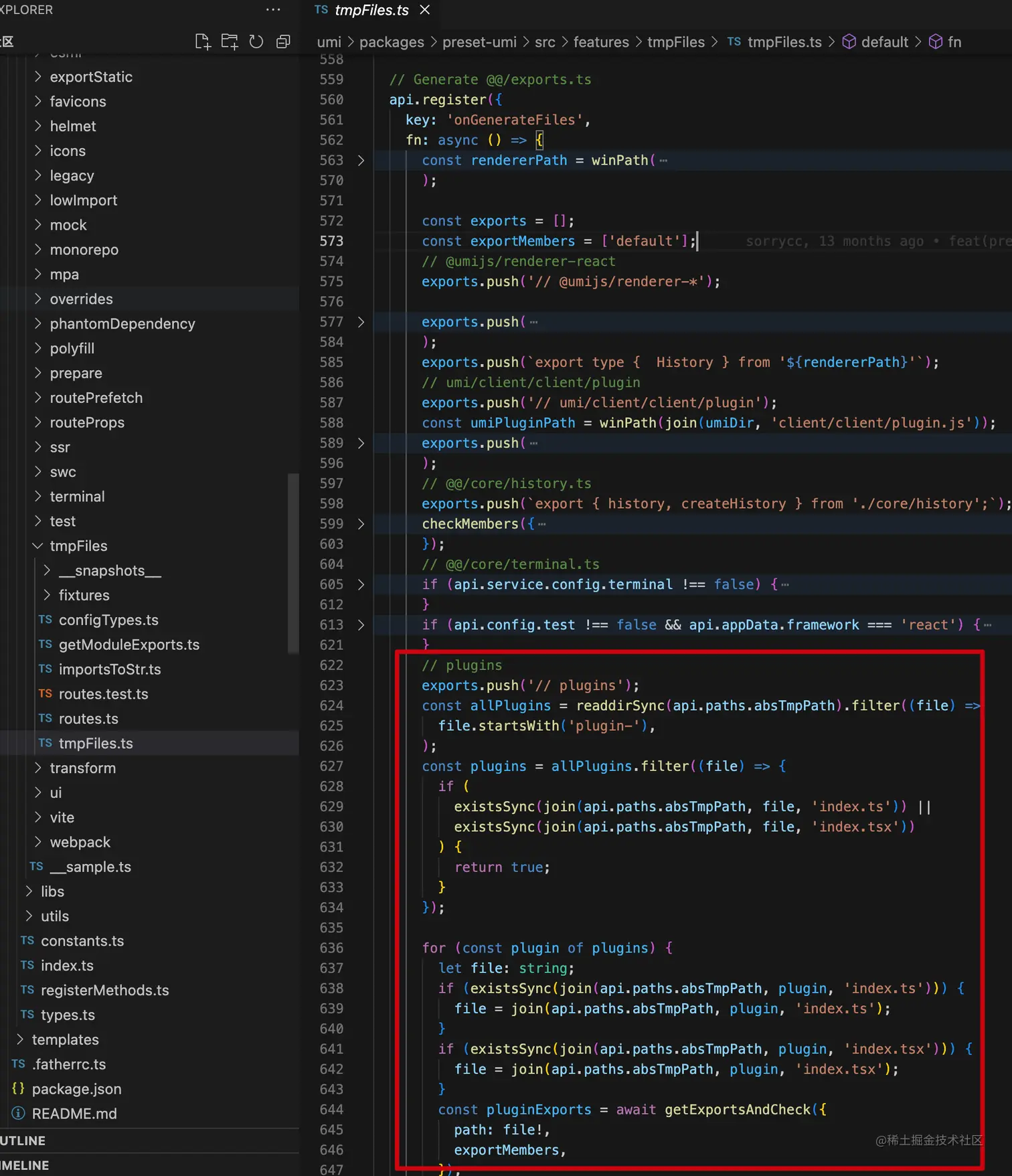 众所周知,Umi 项目中 .umi 目录下存放的是临时文件,那么这个 /.umi/exports 临时文件又是如何生成的呢?答案在 packages/preset-umi/src/features/tmpFiles/tmpFiles.ts 中: