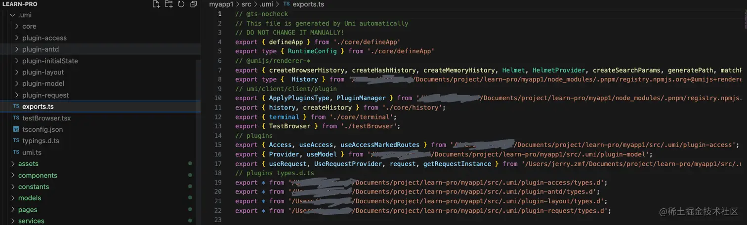 也就是说,实际上 @umijs/max 或 @@/exports 最后都是指向的同一个物理文件,即 /examples/with-use-model/src/.umi/exports: