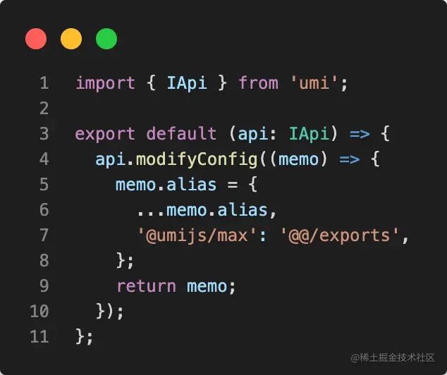 这个时候我们需要翻看下@umijs/max 的源码,在 /packages/max/src/plugins/maxAlias.ts 文件中,@umijs/max 基于 Umi 插件协议修改了 webpack 配置,配置了 alias 别名 @@/exports :