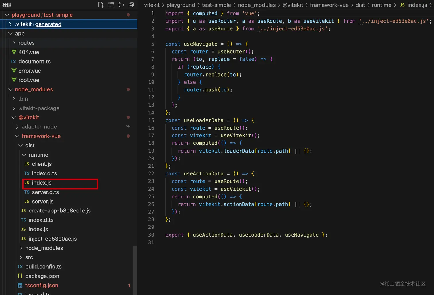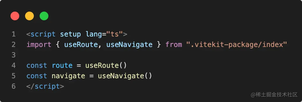 相同的地方是,页面中依然是直接从 .vitekit-package/index 中获取 useRoute 和 useNavigate 方法。