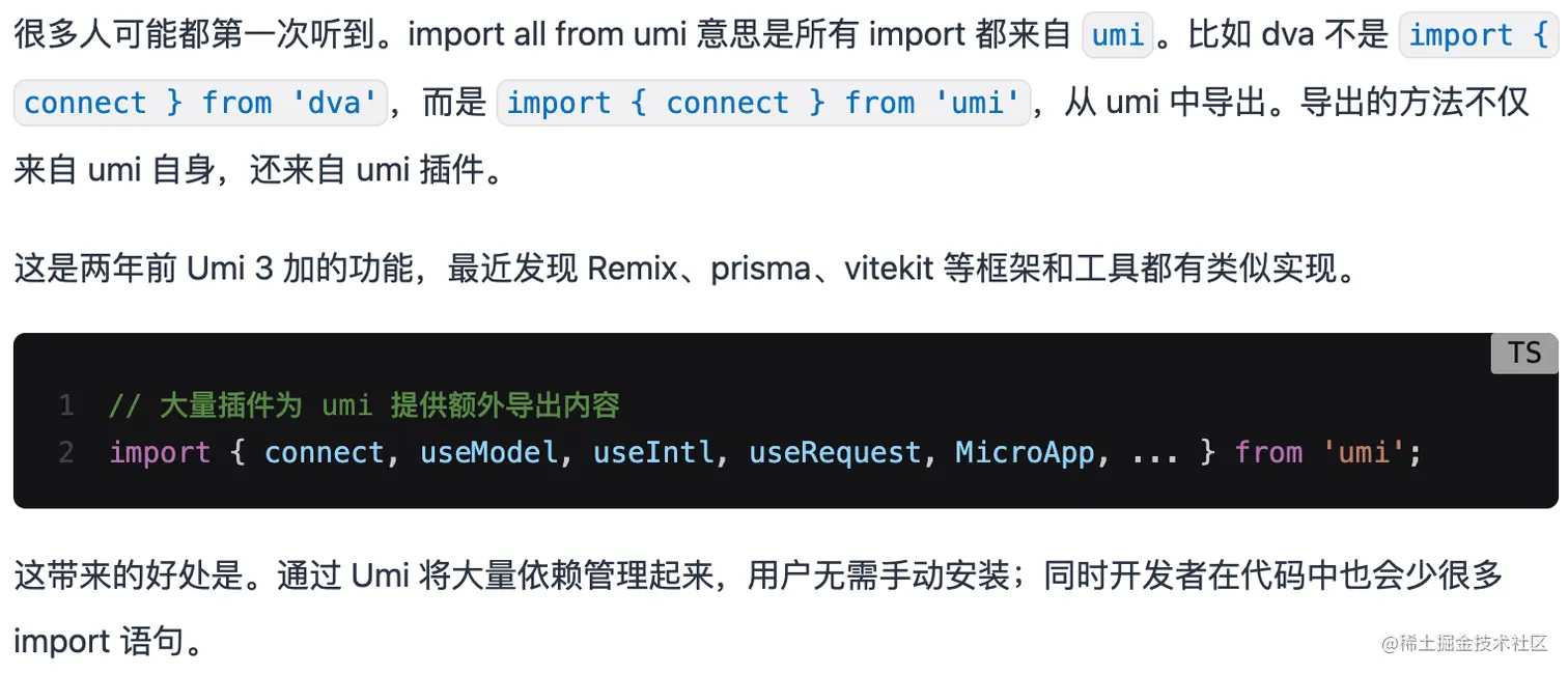 从这段话中我们发现了一个有趣的功能 import all from 'umi',简单说就是所有能力都从 umi 中去 import 获取,Umi 还支持通过插件扩展 import all from 'umi' 的能力。