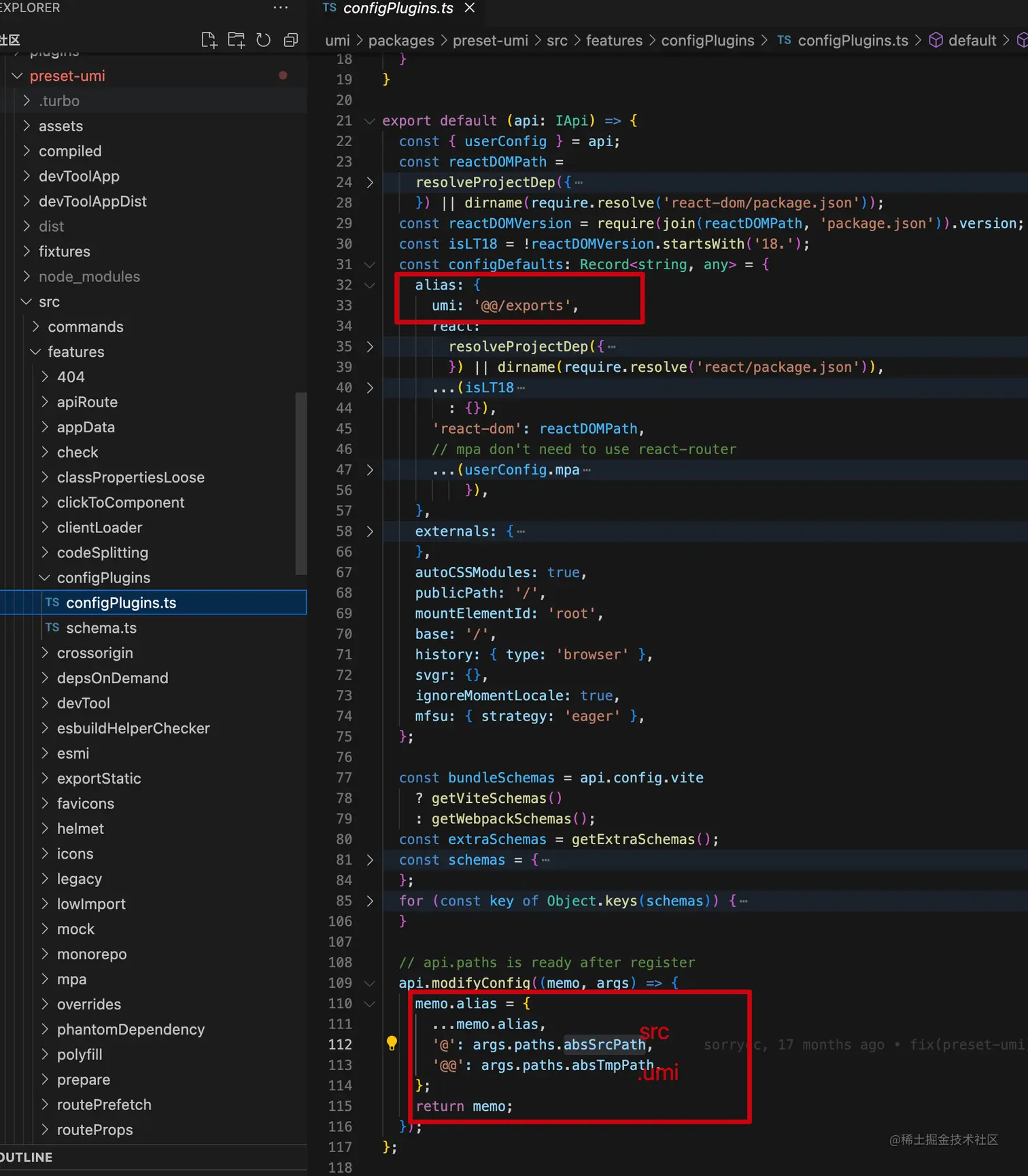 那么 @@/eports 的物理文件究竟又指向哪里呢?我们可以在 /packages/preset-umi/src/features/configPlugins/configPlugins.ts 中找到答案: