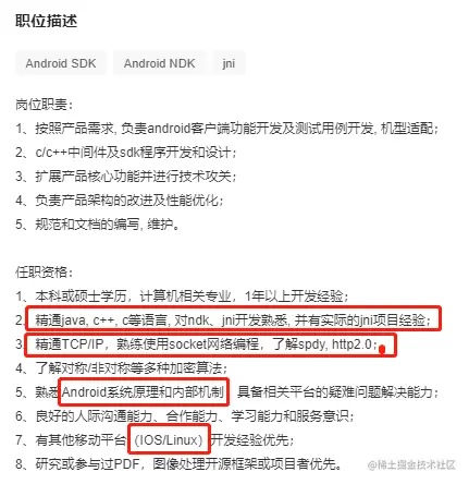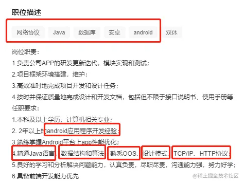 我们直接去找想要应聘的Android开发岗位,查看需要具备那些技术条件。我们抓取一些招聘条件分析一下: