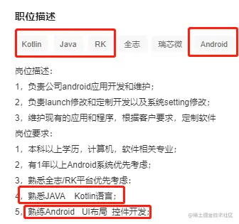从这些岗位可以看出基本上除了Android开发经验外,还要会kotlin、Java、UI布局、网络框架协议、c++、数据算法、设计模式等等。这些技术在市场上都比较硬核。学习好这些才能在行业中竞争。