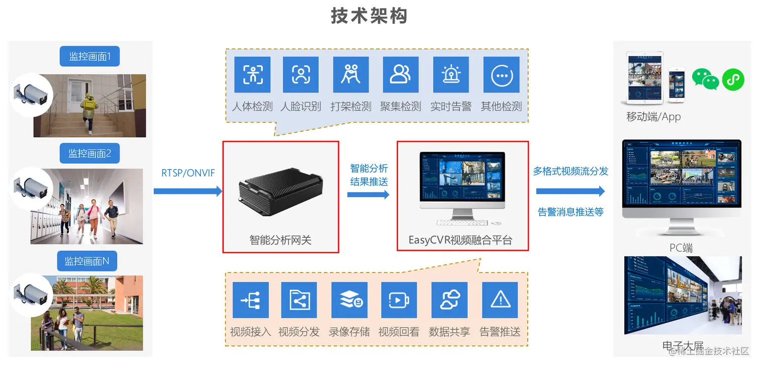 AI智能分析网关通过部署多种AI深度学习算法,对校园的监控视频图像进行实时分析,可实现校园多场景的智慧可视化管理,在重点区域、公共区域、危险区域等布控网络摄像头,实时检测区域入侵、人员逗留、打架斗殴、跌倒、人员聚集、吸烟、攀高等行为,出现异常情况可及时告警,时刻保障校园安全。
