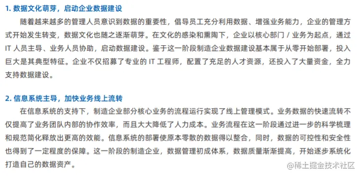 进入成熟阶段,制造企业以消除内部数据壁垒、促进生产经营效率最大化为目标,利用数字平台对所有数据资产进行统一管理和规划,减少数据建设的冗余部署。数据实现了跨部门、跨业务、跨系统的 无障碍流动,数据效能贯穿于企业日常运营、管理决策、战略制定全过程。企业甚至开始以内部数据资源为依托,向外进行能力辐射。