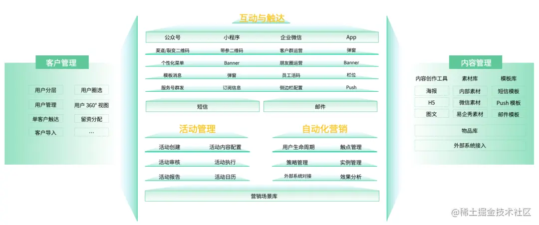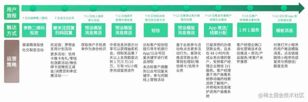 基于用户旅程,利用多渠道的触达体系进行业务线索获取、培育,配置自动化流程营销 SOP,完成从渠道内容投放、引导用户关注公众号参与活动、通知用户领取活动奖励、针对目标客群进行二次营销和渠道的交叉转化的运营策略。