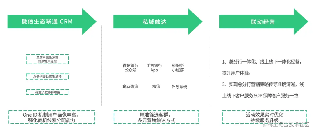 以某国有行总分联动经营为例。该国有行利用 One ID 机制,打通微信生态和 CRM 触点,丰富用户画像,对内完成营销策略准确传导,提高了总分行联动营销的承接能力,强化商机线索的分配能力。