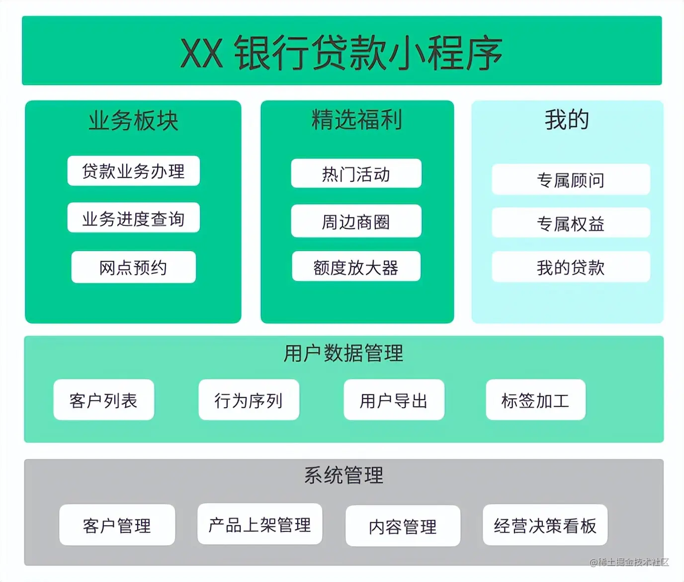 举个例子,某银行基于贷款业务属性,可以结合小程序的定位,梳理相关产品需求,进行功能框架的设计。包括“业务板块”“精选福利”和“我的”板块。其中“业务板块”以查询、预约、便捷化操作的业务为主;“精选福利”聚合了品牌的热门活动,集合商户资源共建周边金融消费商圈,还有提额工具作为福利;“我的”板块直连专属顾问服务,并可查看业务基本情况和专属权益。