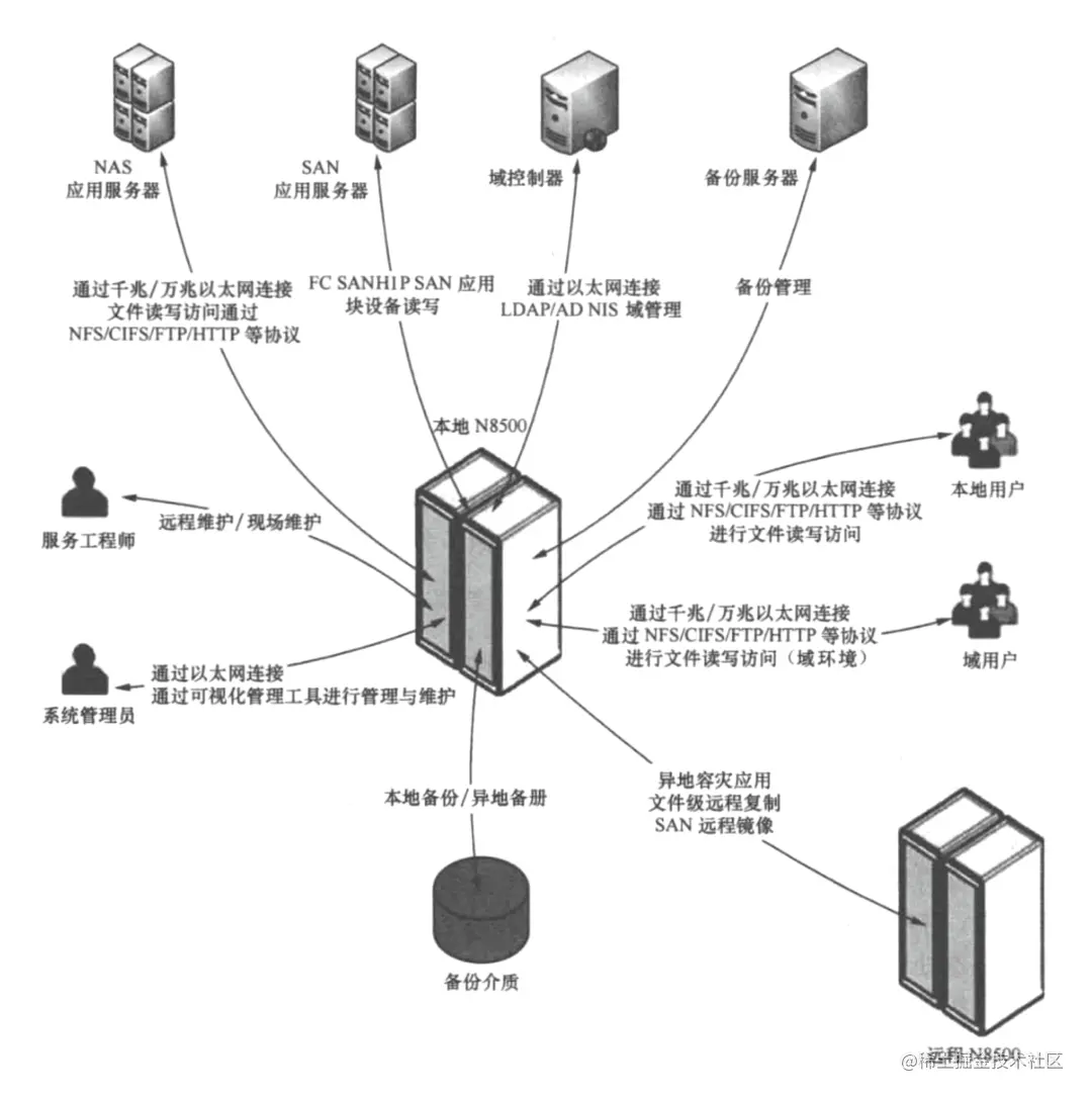 与SAN以块级数据为基本访问单位不同,NAS建立了以文件存储和共享为出发点,以大型、集中化存储管理为趋势的数据中心,又被称为 “文件共享服务器”和“网络文件存储设备” 。