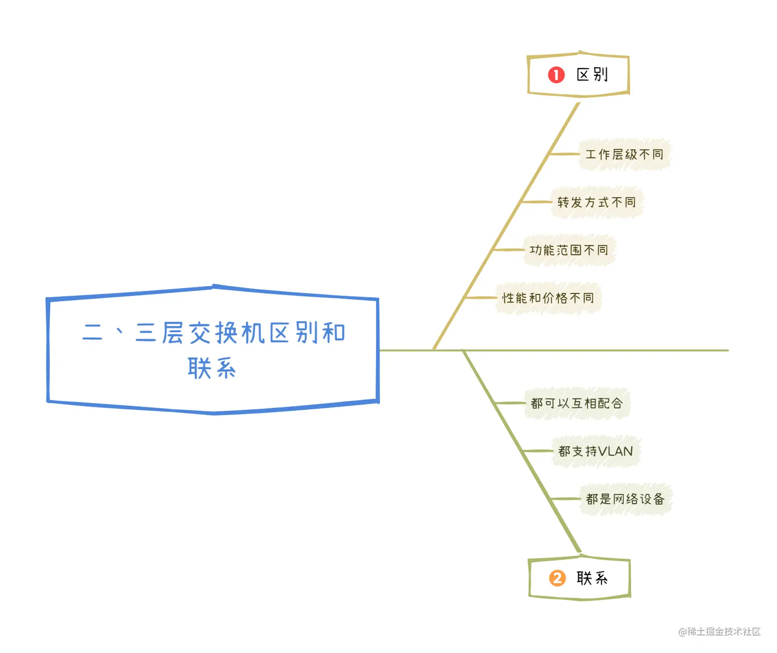 - 转发方式不同:二层交换机通过广播和学习来实现数据帧的转发,只需要查找地址表中的目标MAC地址对应的端口,不需要对数据帧进行解封装和封装;三层交换机通过路由算法来实现数据包的转发,需要对数据包进行解封装和封装,根据路由表中的目标IP地址对应的下一跳地址来选择最佳路径。