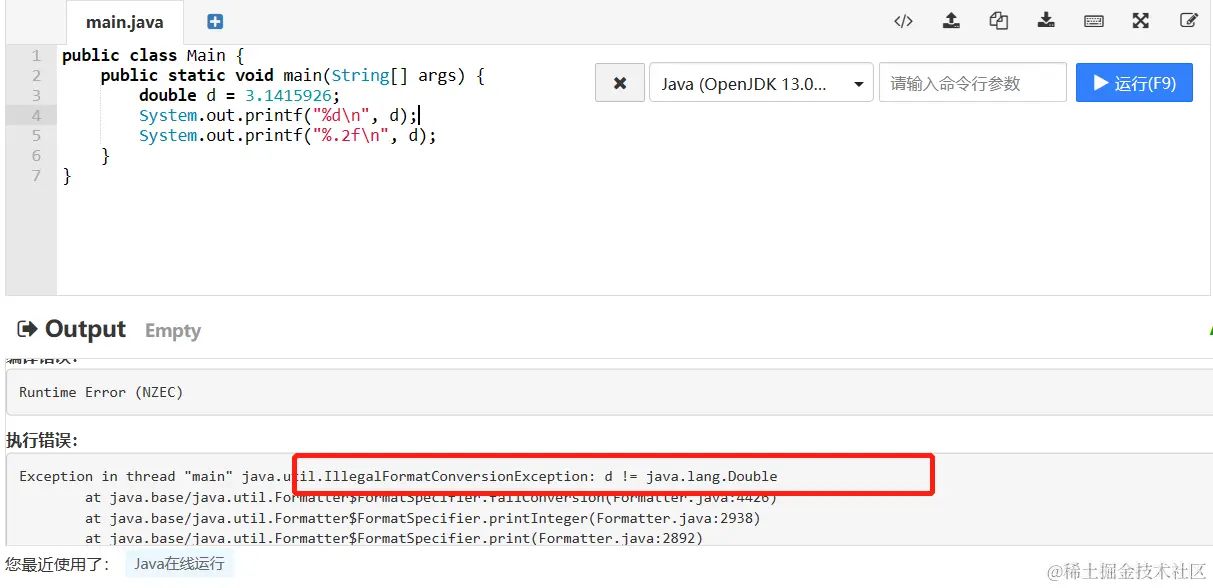 - 注意不管是Java还是python中进行格式化都要格式一致,python中浮点数和整数可以直接转,但是如下图Java中浮点数不能直接格式化输出整数
