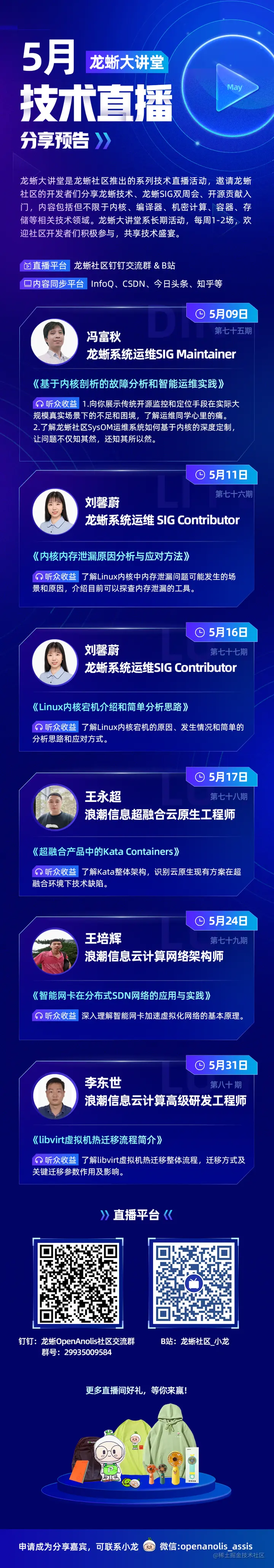 「龙蜥大讲堂」5 月精彩预告来了,点击下方海报抢先了解。本月又是满满的技术干货分享,多位大咖带你共享技术盛宴!提前扫码进群,参与互动还有龙蜥精美周边等你来拿。