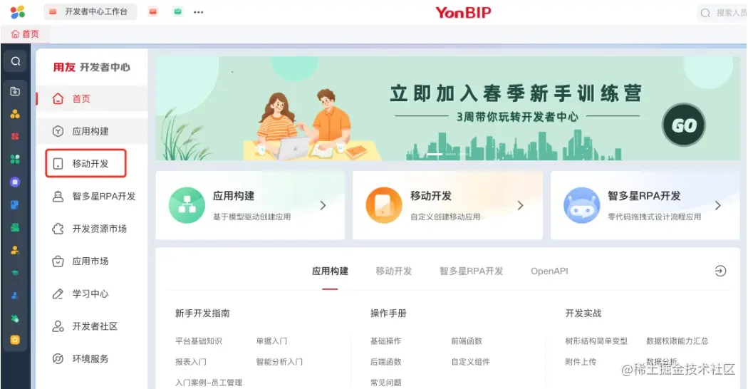 页面访问路径: 登录用友开发者中心网站:developer.yonyou.com - 点击左侧菜单栏中的「移动开发」(或 点击左上角「大风车」图标,选择 云平台-低代码开发平台-移动APP开发)