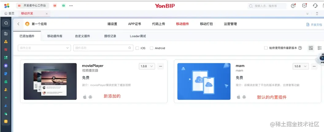 上面介绍了未登录状态下,查看移动插件的方式,当真正想要使用移动插件时,还是需要在登录状态下进行。当前官方提供两种添加移动插件的方式,下面以集成一个 moviePlayer 为例(这个是官方封装的免费的视频播放器移动插件),详细讲述下如何使用YonBuilder移动开发的移动插件。