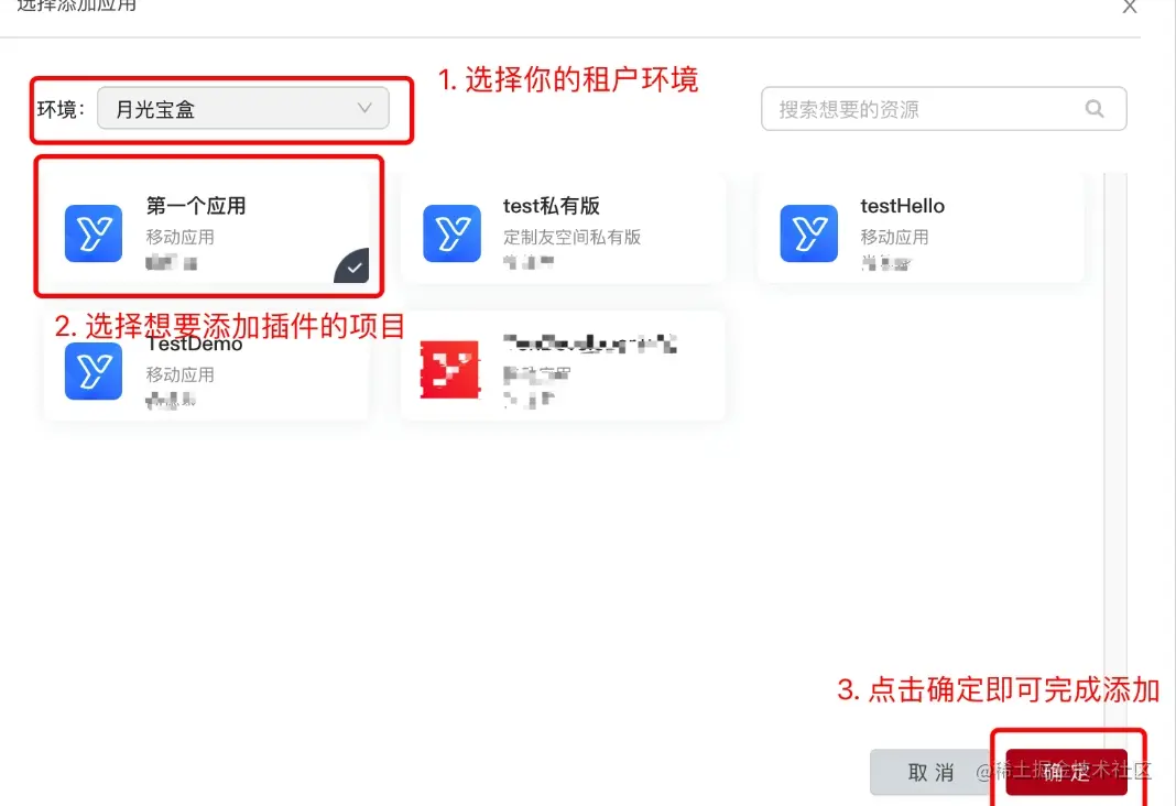 即在登录状态下,按上面 8.1 介绍的方式,访问资源市场 ,搜索栏输入关键词 moviePlayer,找到对应的插件,点击打开插件详情页,然后点击「立即使用」按钮,在弹出的弹窗上选择对应的租户和应用,即可完成插件的添加。