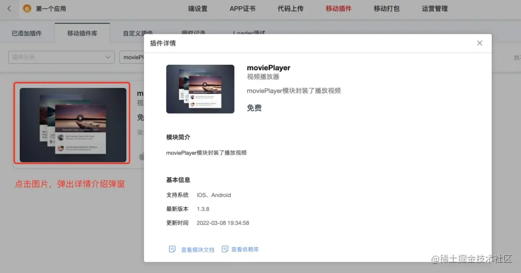 列表页选择对应的应用,点击即可进入应用的管理界面 - 切换导航到「移动插件」- 二级导航切换到「移动插件库」- 搜索栏输入关键词 moviePlayer - 找到对应的插件,点击 + 按钮,完成插件的添加