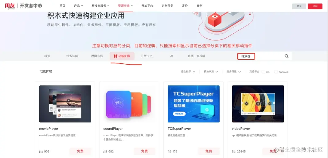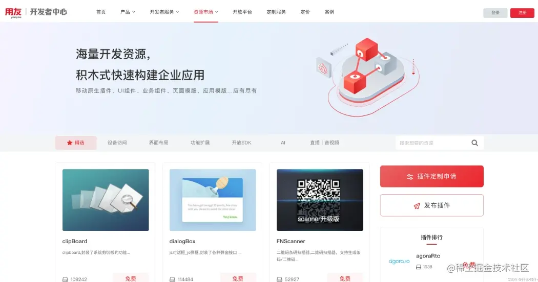 当前YonBuilder移动开发官网已上线1400+的各种功能的「移动插件」供开发者使用,有兴趣的同学可以访问官方开发者中心 -> 资源市场 -> 移动插件,进行查看 (本方式无需登录)