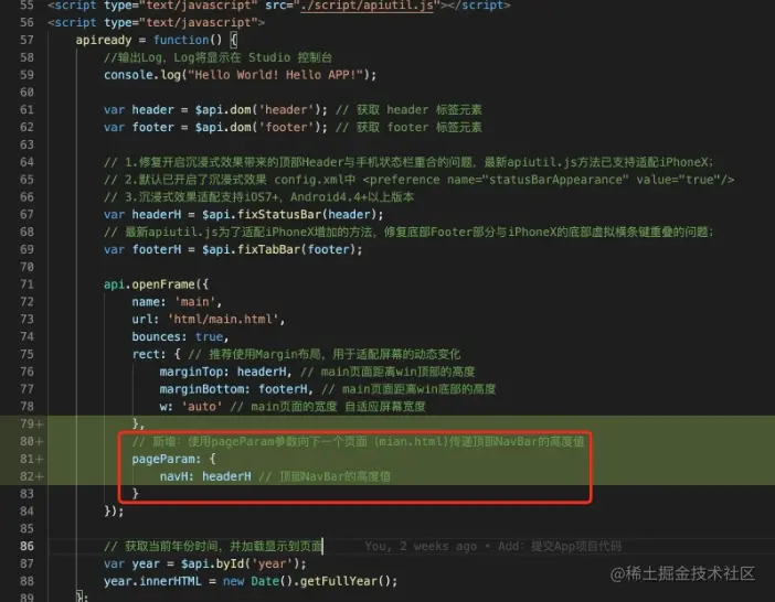 该修改是为了呼应 8.3.1 操作中 第 3 步 中PS3 描述的 获取 api.pageParam 参数值,将页面顶部 NavBar占据的高度值(包括 statusBar 占据的高度) 发给 main.html 页面,供 播放器 设置距离顶部的距离。